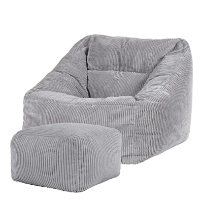 icon Natalia Cord Bean Bag Chair with Footstool, Grey, Large Adult Filling Included, Comfy Chair, Armchair, Living Room, Room Furniture, Bedroom Furniture