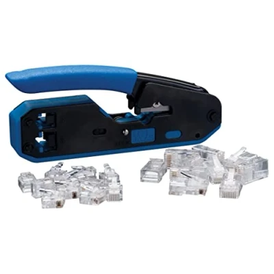 MODULAR PLUG CRIMPER: Reliable and consistent crimping for different modular plugs. All-in-one tool that can terminate plugs to twisted pair cable. The tool can cut cables, strip jackets and crimp RJ-45 and RJ-11/12 connectors. CONSTRUCTION: The crimper is manufactured with a black oxide-coated steel core frame that ensures durability with additional strength for reliable performance. No user adjustements are required on this tool. PRACTICAL SOLUTION: This kit contains connectors and tool to terminate new cables or repair and replace broken connectors on existing cables. 10 RJ-45 CAT5e connecotrs for Data cables and 10 RJ-11 connecotrs for Voice cables are included. WIDE COMPATIBILITY: This plug crimper cuts, strips and crimps CAT3/5e/6 cables and includes fixed die cavities for RJ-45 (8P8C) and RJ-11 (6P6C, 6P4C, 6P2C) modular plugs. This tool is not for feed-thru style connectors. SPECIFICATIONS: The package includes [1] crimping tool kit with [10] RJ-11 6P6C plugs and [10] RJ-45 (8P8C CAT5e) modular plugs.