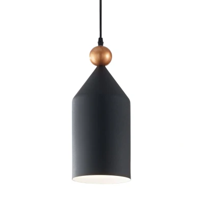 This pendant range has a bold look which is sure to enhance any modern setting. The fittings have a black ceiling base, golden finish spherical decoration, and a black shade with a white inner. The fittings are available in single pendants, each with a shade of a different shape. In addition, a three light version is available, which has one of each shape shade. Class one.
