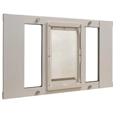 High quality white finish aluminum construction installs easily into most aluminum sash window styles. Medium Sash Window Pet Door height is 16-5/8" Flexible flap is made of clear vinyl to allow pet to see through opening and is non-toxic for added safety Flap Size: 7” x 11-1/4”. Recommended for pets 13 to 35 Pounds Animal Lock-Out slide included Elegant white aluminum finish: Crafted with high-quality materials, it's not just durable but also adds a touch of elegance to your window.