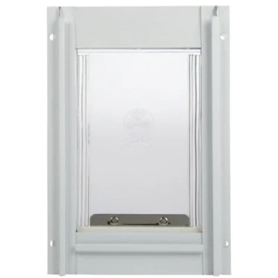 Strong aluminum frame pet door that installs in doors from 1/2" to 1-3/4" thick Includes a clear vinyl flap with patented edges that won’t warp from use or extreme temperatures and a Spring-loaded Lockout Slide feature to keep your Ideal Pet out of mischief when unsupervised Pet foor cutout size is 15-1/2" x 22-3/8" Comes with everything you'll need: all hardware, template, and easy-to-follow instructions Recommended for pets 91 to 120 Lbs