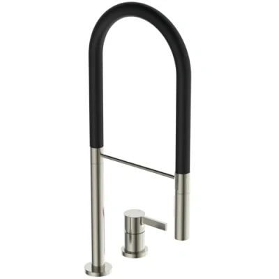 Ideal Standard Gusto, Professional Single Lever Mixer for Two Hole Kitchen Sink, Tubular high spout with Adjustable and Removable Hand Shower, Silver Storm