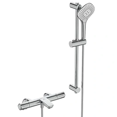 Ideal Standard T100 Exposed Thermostatic Rim Mounted Bath Shower Mixer with Idealrain Evo Jet 3 Function Diamond 125mm Handspray, 600mm Rail and 1.75m Idealflex Hose Chrome
