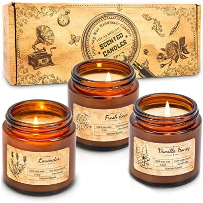 3 FRAGRANCES SCENTS: The romantic Rose scent gives a feeling of walking in the garden. A gentle Lavender scent like a forest after the rain, offering peace and relaxation. The Vanilla Honey scent followed by a sense of sweetness and happiness. 100% NATURAL SOY WAX: The scented candles are made of 100% soy wax with essential oil. It won't generate smoke, harmless, and no pollution. Essential oils do not contain acrid ingredients, which is safe for the elderly and children. HIGH-QUALITY REUSEABLE JAR: Elegant brown amber glass container makes the glow of candlelight more warm and beautiful. The label can be removed and the jar can also be used for balms, lotions, spices after the candle is burned. IDEAL GIFT: Stylish retro packaging, special glass jar. From the packaging to the container, they are all carefully and specially designed. When your family, friends, or lovers receive this scented candle gift set, they can feel your intentions and sincerity. 100% SATISFACTION: IDEALHOUSE provides full refunds and returns if there are any problems after receiving the product. Just let us know and we will solve the issue and answer your concern at the soonest.