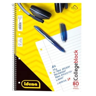 College pads are one of the most popular writing pads and are indispensable in everyday school, university and work life The Idena notepad with ruling style 27 offers 80 sheets of lined paper in DIN A4 format with a grammage of 70 g/m² The individual sheets are perforated and 4 punched holes, which allows a clean tear and instant filing The spiral binding allows for quick page changes and holds the sheets securely together Comments and text corrections can be inserted on the edge next to the two-sided margins