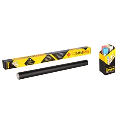1 roll of blackboard film, 45 cm x 2 m Colour: black Can be individually cut to size Self-adhesive, suitable for smooth surfaces 4 chalks: 1 each of white, blue, yellow, red, Manufacturer: Iden