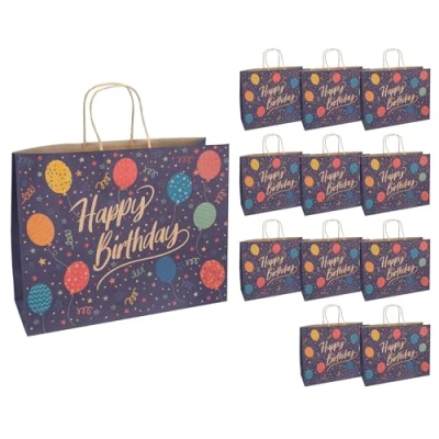 With the colourfully designed gift bags, your gifts are quickly and nicely packaged Includes 12 bags in dark blue with "Happy Birthday" balloons Each gift bag has a size of approx. 33 x 12 x 26 cm (width x depth x height) High stability thanks to a base and comfortable to wear thanks to two paper cords The sustainable gift bags made from certified FSC mix paper can be reused and given as a gift