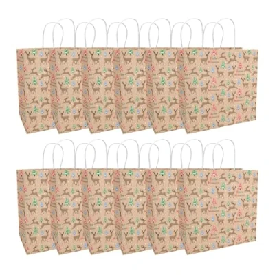 With the elegantly designed gift bags, your gifts are packed quickly and nicely Included are 12 bags in brown with reindeer and fir trees Each gift bag measures approximately 28 x 28 x 15 cm High stability thanks to a base and comfortable to wear thanks to two carrying straps The sustainable gift boxes made from certified FSC mix paper can be reused and given as a gift