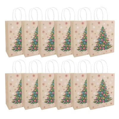 With the elegantly designed gift bags, your gifts are packed quickly and nicely Included are 12 bags in beige with Christmas tree Each gift bag has a size of approx. 21 x 27 x 11 cm High stability thanks to a base and comfortable to wear thanks to two carrying straps The sustainable gift bags made from certified FSC mix paper can be reused and given as a gift