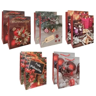 With the colourfully designed gift bags, your gifts are packed quickly and nicely Included are 10 bags with 5 different Christmas designs Each gift bag has a size of approx. 18 x 23 x 8 cm High stability thanks to a base and comfortable to wear thanks to two carrying straps The sustainable gift bags made from certified FSC mix paper can be reused and given as a gift