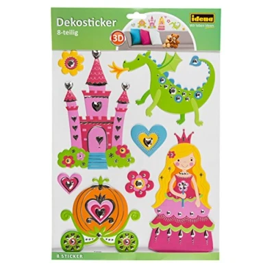 Children's Wall Sticker with 3D and Glitter Effect Total of 8 stickers: princess, castle, dragon, carriage, 2 flowers and 2 hearts Easy to apply, self-adhesive on smooth and dry surfaces Beautiful decoration for your child's bedroom for walls, cupboards or doors The stickers can also be used for crafts and decorating, Manufacturer: Iden Berlin