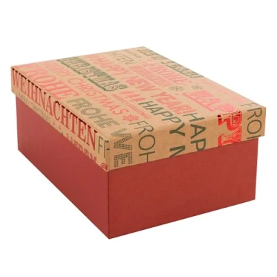 With the elegantly designed gift box, your gifts are quickly and nicely packaged Included is a red box with a brown lid and reads "Merry Christmas" and "Happy New Year" The box has a size of approx. 15 x 20 x 9 cm It can be closed with the enclosed lid, as well as stacked on top of each other The gift box made from certified FSC mix paper can be reused and given as a gift
