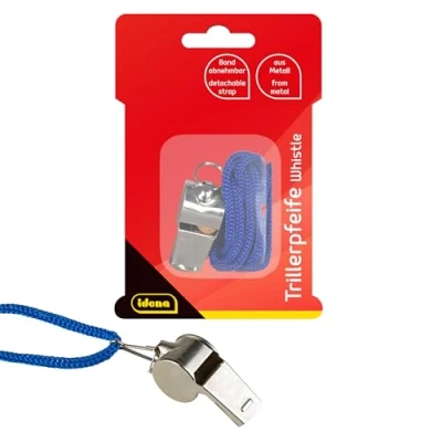 Silver metal signal whistle, when blowing into it produces a shrill, loud sound Whistle with removable blue lanyard, which is attached to the whistle via a carabiner hook Can be hung around the wrist thanks to the strap, so it is always within easy reach and does not get lost Classic accessory for trainers and teachers in sports lessons, dog training, club sports such as football, handball, volleyball or other sports activities Handy size is ideal for taking with you as well as for children as an accessory for carnival and for role play, such as conductor or policeman