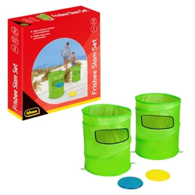 Game set contents: complete Frisbee slam set consisting of 2 foldable green target baskets and 2 throwing discs in blue and yellow Foldable design: easy to store and transport target baskets that fold compactly Dimensions: target baskets with a height of 48 cm and a diameter of 38.5 cm, throwing discs with 20 cm diameter Recommended age: suitable for children aged 6 and up, ideal for 1-4 players for active fun Versatile: perfect for indoor and outdoor use, promotes motor skills and coordination of movements