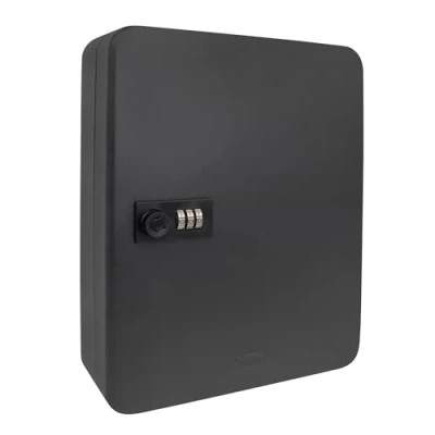 Secure key safe made of steel in size approx. 30 x 24 x 8 cm, equipped with 36 key hooks Individually adjustable, 3-digit combination lock for secure storage Includes 36 coloured plastic keyrings and 54 number stickers to identify the keys or hooks Simple design in black, suitable for office, study or utility room Ideal for storing, storing and organising keys of all kinds