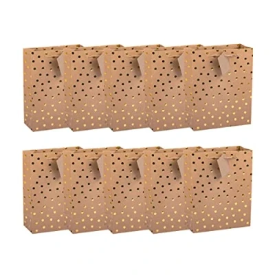 With these gift bags, from Idena, your gifts are packed quickly and nicely Included are 10 bags each measuring 6 x 12 x 16 cm The dark brown gift bags are made of kraft paper and are FSC Mix certified They are printed with many golden dots Fill the bags with toys, sweets or other gifts and make the birthday child's eyes shine