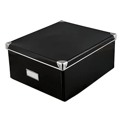 Foldable and sturdy cardboard box with lid and labelling field on the front, size approx. 36 x 28 cm, height approx. 17 cm Lid protects against dust and dirt, the edges are reinforced with metal, making the boxes stackable Elegant and classic design in black, fits very well in the office, study, children's and living room or in the kitchen Ideal for storing and organising documents, clothes, shoes, candles, seasonal decorative items, sewing utensils, toys, cosmetics, cables and much more Made from environmentally friendly and sustainable recycled materials (FSC Recycled), Manufacturer: Iden Berlin