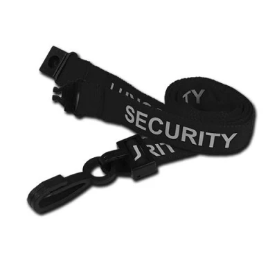 Black Lanyard with White Print Plastic J Clip Safety Breakaway Point