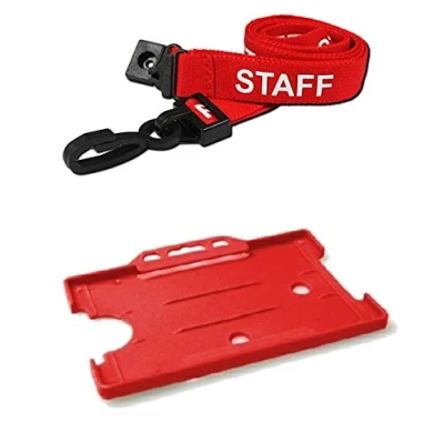 Identity Plus: Red Pre Printed Staff Lanyard Neck Strap (Plastic J Clip, Safety Breakaway Point) with Landscape Card Holder (100)