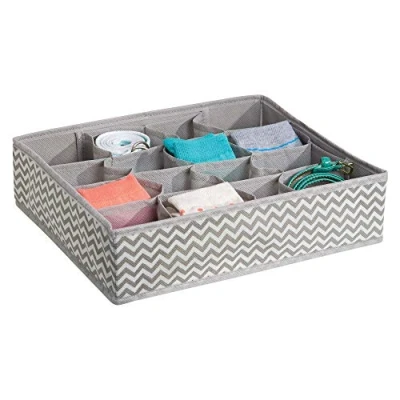 This fabric storage bin is perfect for organising a multitude of items and can hold belts, socks, underwear and other pieces in its 16 compartments The clothes organiser is perfect for maintaining order in the home and provides the ideal place to store accessories neatly; it will maintain organisation The storage bin is versatile and can be used as an underwear drawer organiser, or in the closet, dresser or on shelves; it is multipurpose and useful The storage bin for clothes is measured at 34.9 x 26.7 x 8.9 cm; it is large and can fit in most modern dressers, closets and shelves easily The storage box for clothes is made of a flexible, durable and handsome polypropylene material. It is available in a lovely taupe/natural combination.