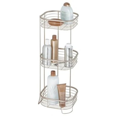 3 tiers of storage for towels, bottles, tissue boxes, and more Free-standing design for use in or outside the shower Satin finish with Thermobond Rust Resistant Coating Made of durable steel 24cm x 24cm x 66.5cm