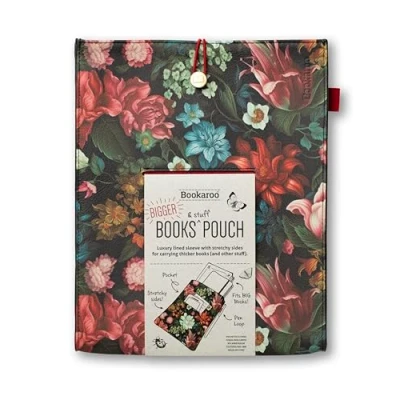 Soft luxury leather-look & lined sleeve for carrying your everyday stationery essentials. Fits a chunky novel or a selection of notebooks, novels and even a small tablet Fits a chunky novel or a selection of notebooks, novels and even a small tablet (opening fits items up to 19cm wide) With handy pocket to slip those extra bits and bobs into! Mix or match with other clever Bookaroo products. A 'Bigger' Book Pouch with expanding sides for bigger books. Adorned with a beautifully illustrated floral collage, depicting vivid coloured blooms on a black background. A very popular theme for sales, this classic moody print is especially current in interiors, fashion and gifts.