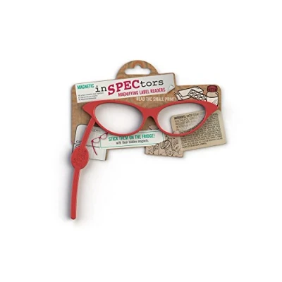 Stick to a magnetic fridge with hidden magnets so you can easily find them when you're in the kitchen, peering at food labels or instructions Double magnification lenses meaning these glasses are perfect for close-ups Three fun frame styles to choose from or just pick your favourite colour Poly carbonate frame with magnet. Acrylic Lenses - 2.5 Magnification Also perfect to slot into your handbag so when you're out shopping or socialising, you can read the tags, labels, instructions, menus - whatever small print you come across