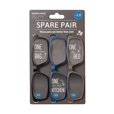 NOW WHERE DID I PUT MY GLASSES? The ideal gift for that friend or relative who is always losing their readers! Each set includes three pairs of the same strength HIGH GRADE OPTICAL LENSES: Superior quality lenses tested to EN 14139:2010, 3 different strengths +1.5, +2.0 and +2.5 EXCELLENT QUALITY FRAMES: In 3 different colours or styles, per set COLOURS TO MATCH YOUR STYLE: Each pack contains 3 different colours, Blue, Grey and Black to help make it easy to accessorise