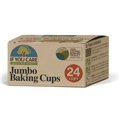 If You Care Jumbo Baking Cups are perfect for both sweet and savoury goods. Made from unbleached, totally chlorine-free (TCF) greaseproof paper, these baking cups have easy release properties perfect for use to make cupcakes, muffins, mini quiches and other recipes.All If You Care paper products are complete chlorine-free and therefore no chlorine derivatives will be dumped into lakes, streams or rivers.Set includes 24 large baking cups.
