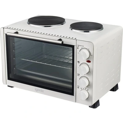 Igenix IG7130 Mini Oven with Electric Grill and Double Hotplate Hob, Ideal for Roasting, Baking, Grilling Reheating Aluminium Baking Tray, 30 Litre, White