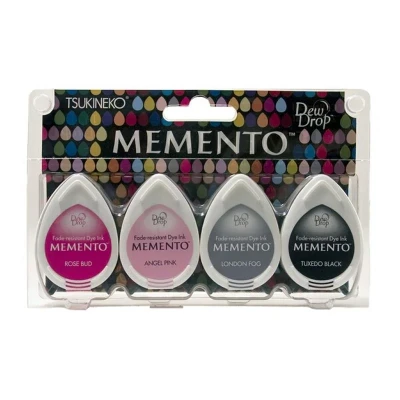 Memento 4 Piece Set Girls Nght Out. Memento dye ink is fast drying and fade resistant. The innovative pad delivers finer impressions and exceptionally even coverage.. Application - Coated paper, vellum, uncoated paper, printer paper. Drying time - 3 to 5 seconds on coated paper. Virtually instant on uncoated papers. Varies based on surface / material, humidity, etc.. Particularly for glossy vellum and coated paper are suited for reproducing fine detail and lines.. Dries very quickly for regular paper like New Years Greeting post cards and schedule stamps.. Brilliancy of the ink is more obvious than regular dye ink resist for water and light.. Memento Dew Drop is suited for colouring the boarder lines and fine detail art works.. Can be used with ink blender for shading and spray effect. *please refer to ink blender.. It is possible to mix with inker.. L size Memento comes with the sticker on side of the cover for easy identification. MD-100-006