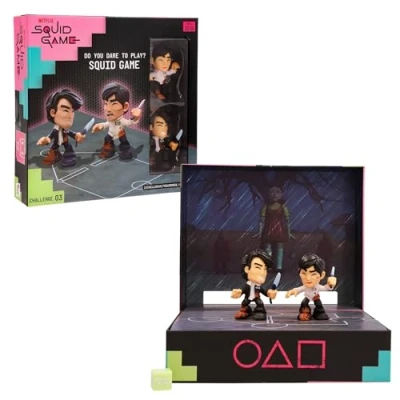 In the final challenge of Squid Game, contestants face a high-stakes game that tests their skills and resolve in a dramatic showdown. The setting is intense and suspenseful, with the outcome determining the fate of the remaining players Set to play and display: each box is decorated inside to recreate the set where the final challenge happens. The two key characters face off in a gripping showdown that will determine their ultimate fate Two figurines from the heart-pounding Squid Game. Bring to life iconic characters from the hit Netflix series. Get players 456 and 218, facing the struggles and dilemmas of the final game, notice his mud-stained, dirty battle-worn attire LET THE GAME BEGIN: roll the dice, each shape indicates a movement. Be careful to not get caught by your enemy 3 times or you will lose the final game Whether proudly showcased on a shelf or incorporated into a display, these figures serve as reminders of the thrilling drama and compelling characters that captured the world's imagination. Don't miss your chance to own a piece of the action. Immerse yourself in the gripping world of "Squid Game" like never before This set of two figurines offer Squid Game fans a tangible connection to the series. Displaying the doll on a shelf or in a collection can evoke memories of key moments from the series and spark conversations among fellow fans Squid Game contains adult themes and violence - not suitable for children, Manufacturer: IMC Toys