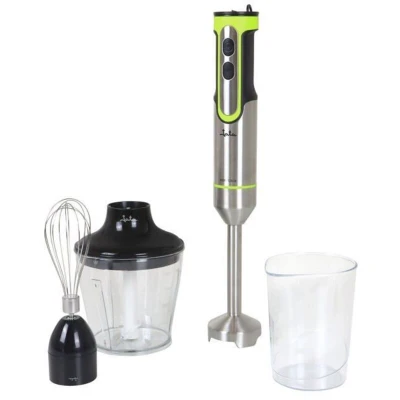 The JATA JEBT1789 handheld mixer is a powerful 1200 W device designed to facilitate the preparation of your recipes. With its 4 stainless steel blades, it allows you to whip, chop, and grind various foods to achieve smooth and homogeneous mixtures quickly and effortlessly. This model offers adjustable speed, as well as a turbo function reaching up to 17,000 rpm, ideal for adjusting power according to the needs of each preparation. The mixer comes with practical accessories, including a stainless steel whisk, a chopper, and a 500 ml measuring cup, all designed to enhance your cooking experience. The base of the mixer, also made of stainless steel, is easily detachable for simplified cleaning. It is recommended to wash the accessories immediately after use to prevent food residues from drying and becoming difficult to remove. The body of the mixer can be cleaned with a slightly damp cloth, but should not be submerged in water. With a compact design and an elegant gray color, this mixer