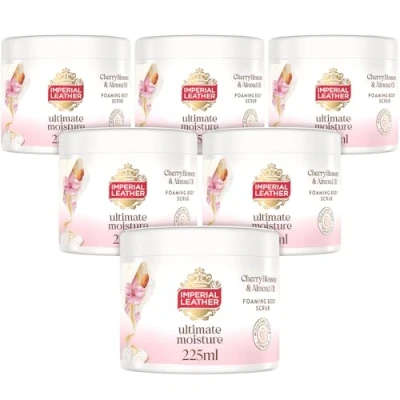 Imperial Leather Ultimate Moisture Cherry Blossom & Almond Oil Foaming Exfoliating Body Scrub, Ultra Rich Lather, Suitable for Sensitive Skin Vegan Cruelty Free (225ml), Multipack 6 x 225ml