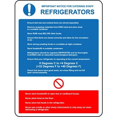 Important notice for catering staff refrigerators temperature kitchen Safety Self adhesive sticker Digitally printed and laminated for extra durability Remove backing film and apply to dry, smooth, oil free surface.