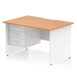 Impulse 1200 x 800mm Scalloped Edge Straight Office Desk Oak Top White Panel End Leg Workstation 1 3 Drawer Fixed Pedestal