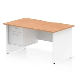 Impulse 1400 x 800mm Scalloped Edge Straight Office Desk Oak Top White Panel End Leg Workstation 1 2 Drawer Fixed Pedestal