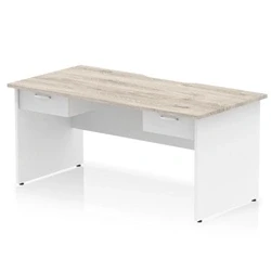 Impulse 1600 x 800mm Scalloped Edge Straight Office Desk Grey Oak Top White Panel End Leg Workstation 2 1 Drawer Fixed Pedestal