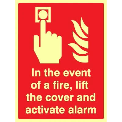 In the event of a fire lift cover and activate alarm Photoluminescent Rigid Sign
