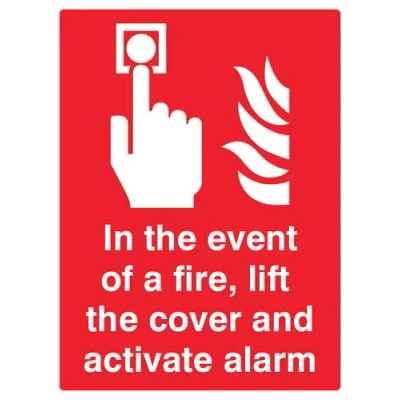 In the event of a fire lift cover and activate alarm Photoluminescent Self Adhesive Sign