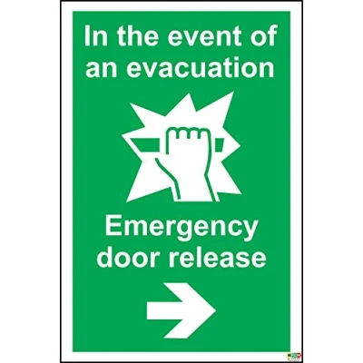 In The Event Of Evacuation Emergency Door Release Safety Sign Self adhesive sticker 150mm x 100mm Remove backing film and apply to dry, smooth, oil free surface. Digitally printed and laminated for extra durabillity