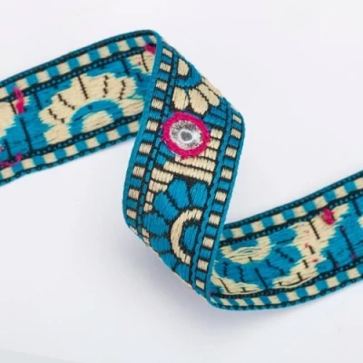 Indian Mirror Embroidery Trim Ribbon Hand Crafted Sequin on Traditional Sari Style Border Trimming.Decoration Clothing & Upholstery, 20mm Wide, Neotrims UK. [Turquoise, 4 MTS]
