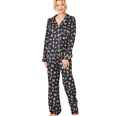 Indigo Sky Womens Astara Full Length Satin Pyjama With Contrast Piping, Dragonfly Print, 18 20