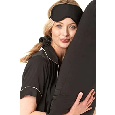 Perfect for gifting & travel, or sleepovers! Our Katrina satin set includes 5 essential pieces. You'll find a cute piped ladies revere collar short pyjama set with with a fully elasticated waist , all outlined in style with contrast piping . Enjoy a relaxing siesta with our comfy elasticated eyemask , match up the messy bun too with our silky scrunchie! Completing the set is our standard sized pillowcase, helping keep the frizz at bay while you snooze. Why not visit our Indigo Sky store for more gorgeous womens lounge & sleepwear including cute hooded robes, silky ladies chemises & chic piped PJs!