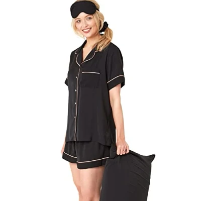 Perfect for gifting & travel, or sleepovers! Our Katrina satin set includes 5 essential pieces. You'll find a cute piped ladies revere collar short pyjama set with with a fully elasticated waist , all outlined in style with contrast piping . Enjoy a relaxing siesta with our comfy elasticated eyemask , match up the messy bun too with our silky scrunchie! Completing the set is our standard sized pillowcase, helping keep the frizz at bay while you snooze. Why not visit our Indigo Sky store for more gorgeous womens lounge & sleepwear including cute hooded robes, silky ladies chemises & chic piped PJs!