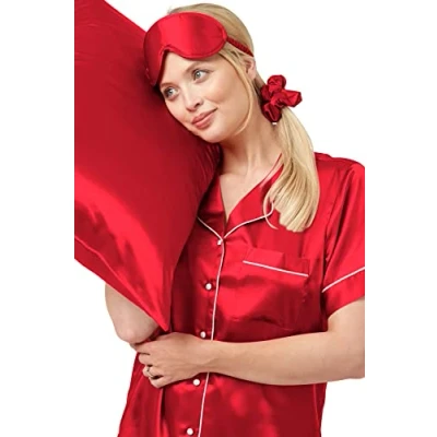 Indigo Sky Womens Katrina 5 Piece Satin Pyjama, Eyemask, Scrunchie & Pillowcase Set, Spice Red, 10 12
