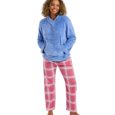 Warm Fleece Pyjama Top for Women – Features a soft shawl collar, long sleeves, and a handwarmer pocket for extra comfort and warmth Brushed Cotton Tartan Pyjama Bottoms – Check print pyjama pants for women trousers made from soft breathable woven cotton Colour Options: Pink or Blue – Our Indigo Sky Lizzie ladies' pyjama set includes matching tartan pure cotton printed bottoms for a coordinated look Perfect for Lounging or Travel – Soft & comfy pyjama set for women for relaxing at home, winter nights, or packing for a cosy camping trip Great for gifting - Treat her to comfy nightwear & loungewear for women and she'll be cosy all year round