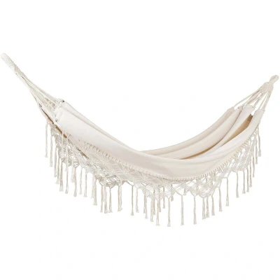 General description This lovely hammock elevates the look of any porch, terrace, or indoor area. It is made from a hard-wearing fabric in a color that matches any décor style. Decorated with handmade crochet and tassels on the edges, it gives off boho vibes. Gorgeous and comfortable, it will surely become your favorite spot for relaxing. The hammock is placed in its own bag and is ready to be installed. Technical specifications Product Type: Hammock Style: Boho General Color: Beige Main Material: Cotton Material Composition: 35% Polyester Dimensions: Depth: 150 cm, Width: 290 cm, Height: 0.5 cm Seating Surface: 150x200 cm Weight: 2 kg Weight Capacity: 150 kg Usage Great relaxation spot Both for indoor and outdoor use Exceptionally easy care Other information Does not require assembly Furniture resistant to UV rays showcases increased resistance to fading or discoloration Maintenance tips: Hand-wash only, use cold water and a mild cleaner; wash on the right side with zipper closed; do