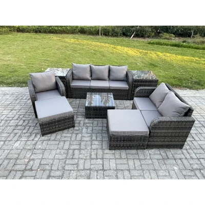 Indoor Outdoor Rattan Garden Furniture 8 Seater Set Table Sofa Chair Patio Conservatory with Grey Cushions 2 Side Tables Big Footstool Fimous