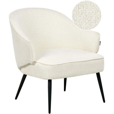 General description This cosy teddy-style armchair is a comfortable and visually appealing addition to any living room. Upholstered in soft off-white bouclé fabric, the rounded seat and backrest offer both support and a cosy look. The powder-coated metal legs ensure stability and add a subtle visual contrast, making it a perfect fit for modern or industrial interiors. It serves well as an extra seating option or a decorative piece in your relaxation area. Technical specifications Product Type: Armchair Style: Industrial General Color: White, Black Shade: Off-White Main Material: Boucle Additional Material: Wood Filling Material: Sponge Legs Material: Metal Material Composition: 100% Polyester Armrests: Yes Seat Construction: Elastic Belt Seat Foam Density: 28 kg/m3 Dimensions: Armrests Height: 64 cm, Depth: 76 cm, Seat Thickness: 12 cm, Seat Height: 50 cm, Width: 70 cm, Height: 77 cm, Seating Surface: 55x62 cm Weight: 10 kg Weight Capacity: 130 kg Installation Partial Assembly